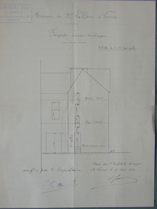 Plan de la façade arrière de la maison Le Corre par Jasseron, 1912. AM Vannes 5 I162.Immatriculation