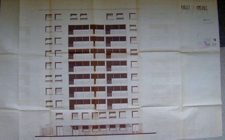 Elévation de la façade sur cour de l'immeuble par Guillou, 1960. AM Vannes 1G59.Immatriculation