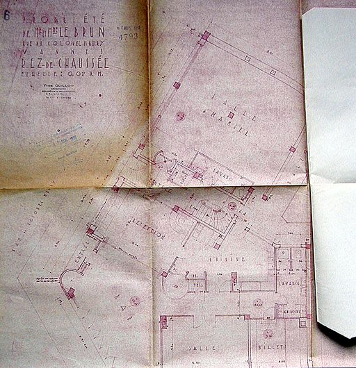 Plan du rez-de-chaussée avec proposition d'un escalier à retour par Guillou, 1950. AM Vannes 1G59.Immatriculation