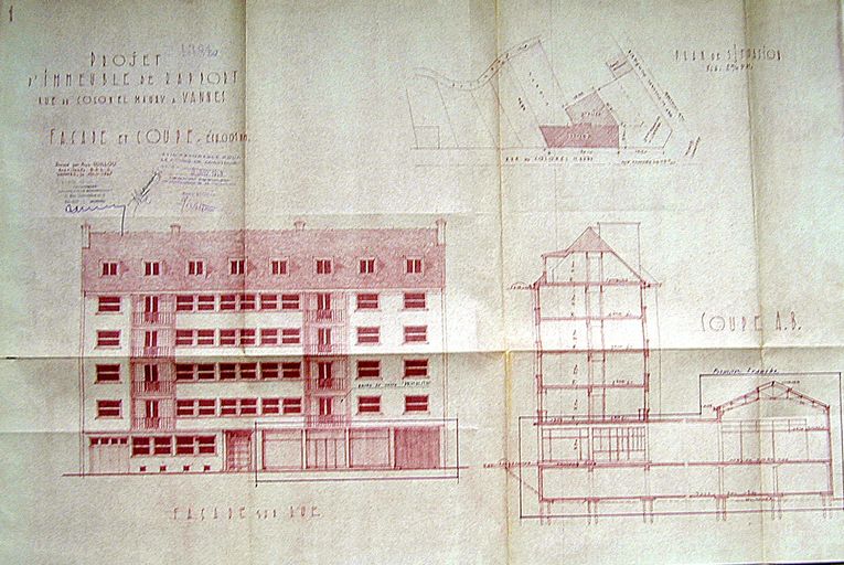Elévation de l'immeuble par Guillou : façade et coupe, 1947. AM Vannes 1G56 et AD Morbihan 110J4487.Immatriculation