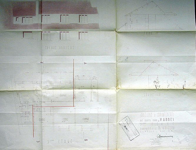 Aménagement des combles. Plan du 5ème étage par Guillou, 1952. AM Vannes 1G59.Immatriculation
