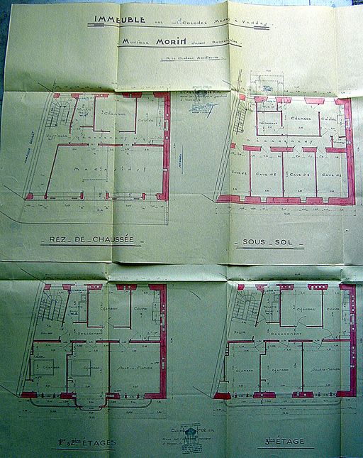Plan des R-D-C-, sous-sol et 1,2,3 étages par Le Cloërec, 1939. AM, Vannes 5I162.Immatriculation