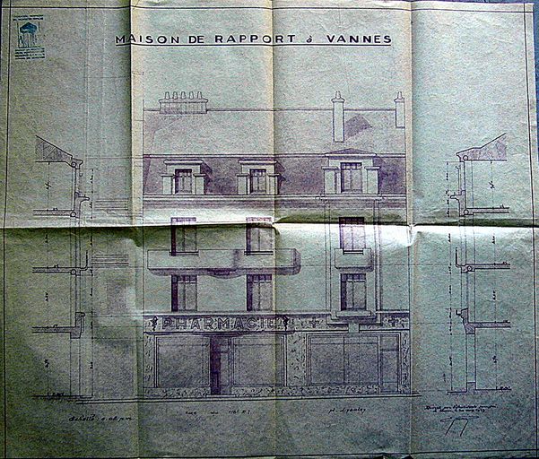Projet d'élévation de la maison de rapport par E. Gemain, 1939. AM Vannes 5 I 162.Immatriculation