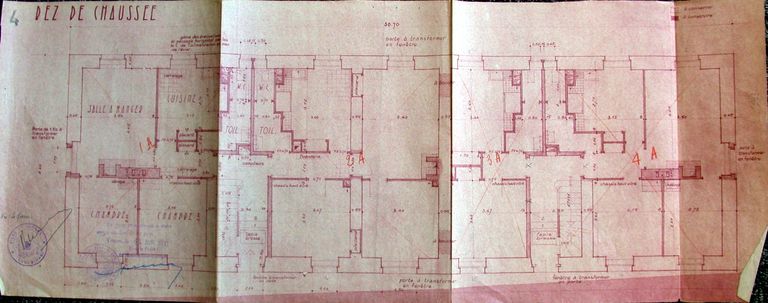Transformation de l'ancienne infirmerie en HLM. Projet de Yves Guillou, 1949. Plan du rez-de chaussée. AD Morbihan 110 J 4013.Immatriculation