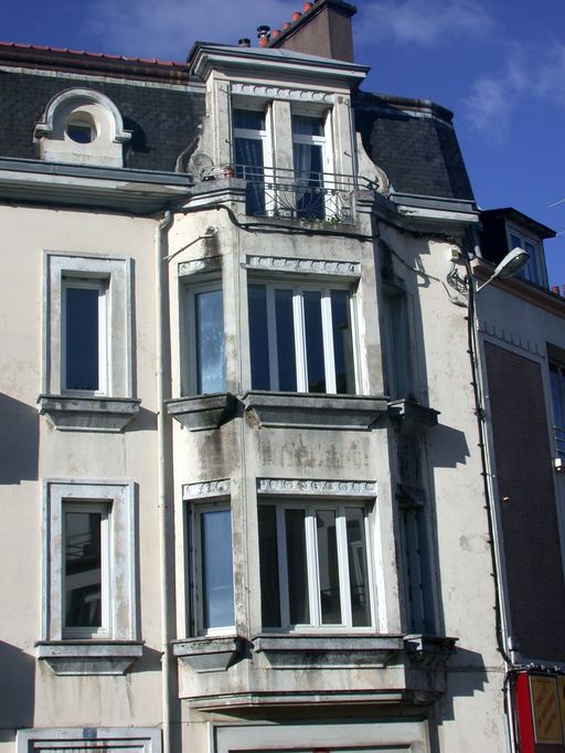 Détail de la travée avec oriel et lucarne superposée.Immatriculation