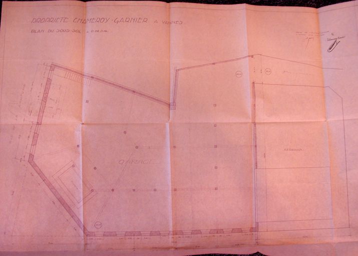 Plan du sous-sol du garage Chameroy et Garnier par Gemain, 31 mars 1930. AD Morbihan 5 M 230 garages.Immatriculation