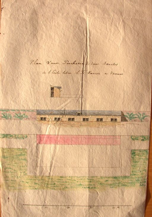 Elévation et plan de la porcherie de l'école libre de Saint-François, 19 janvier 1865. AD Morbihan 5 M 230.Immatriculation