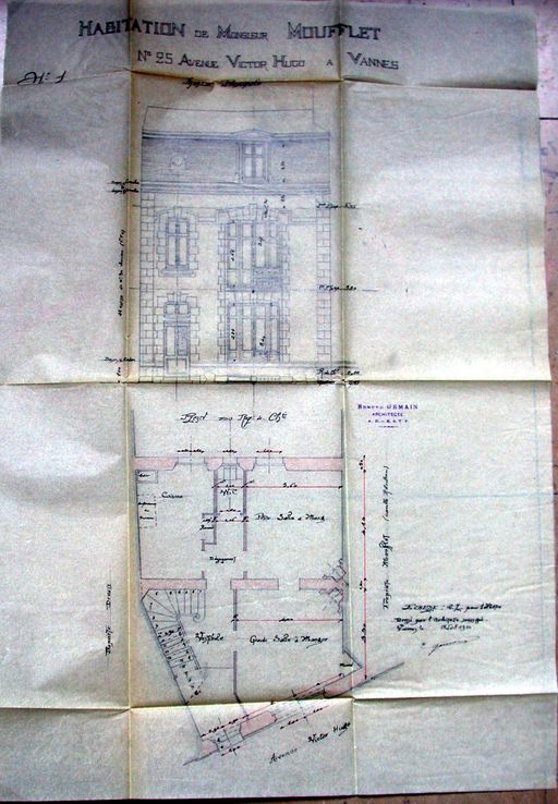Plan du rez-de-chaussée et élévation antérieure, par E. Gemain, avril 1910. AM Vannes 5 I 162.Immatriculation