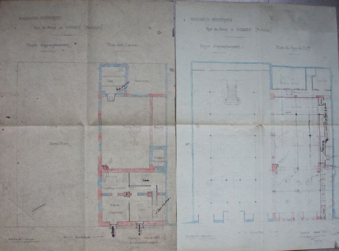 Projet d'agrandissement par Joseph Caubert de Cléry, janvier 1920 : plans des caves et du rez-de-chaussée. AM Vannes 5 I 162.Immatriculation