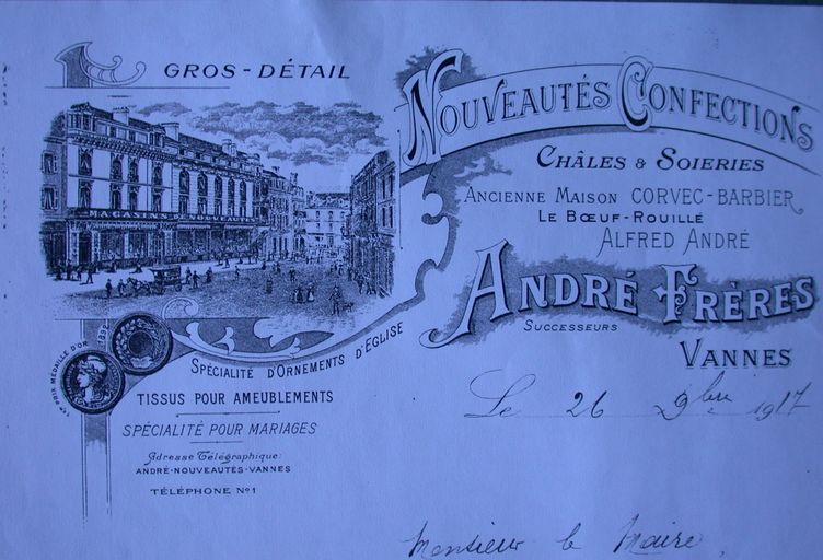 Détail de l'en-tête de lettre des Magasins André frères, 1917. AM Vannes 7Fi.Immatriculation