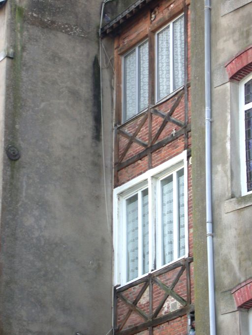 Façade postérieure : détail du corps doublé en briques et pan de bois.Immatriculation
