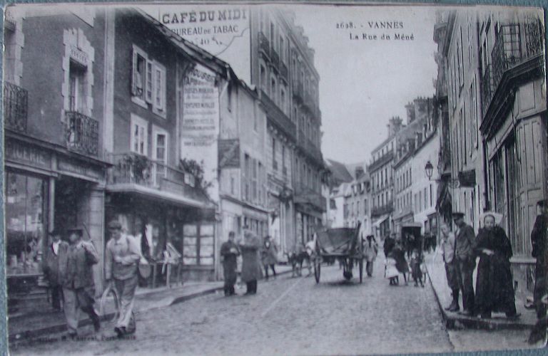 Vue du bas de la rue du Mené avec vue sur une partie de l'immeuble. Collection H. Laurent, Port-Louis. Carte postale ancienne. AM Vannes 7Fi.Immatriculation