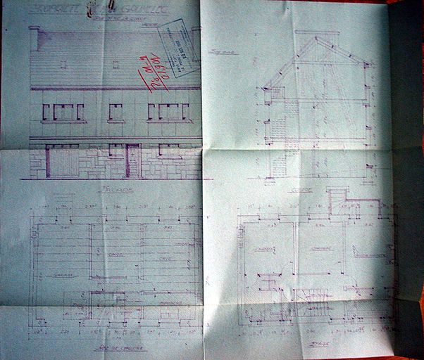 Plan au sol, élévation et coupe de la maison Le Grumelec. AM Vannes 1G59.Immatriculation