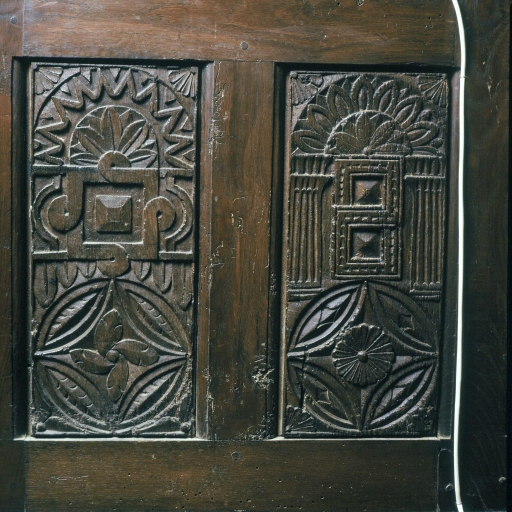 Détail de panneaux sculptés ornant la cage d'escalier menant du rez-de-chaussée à l'étageImmatriculation