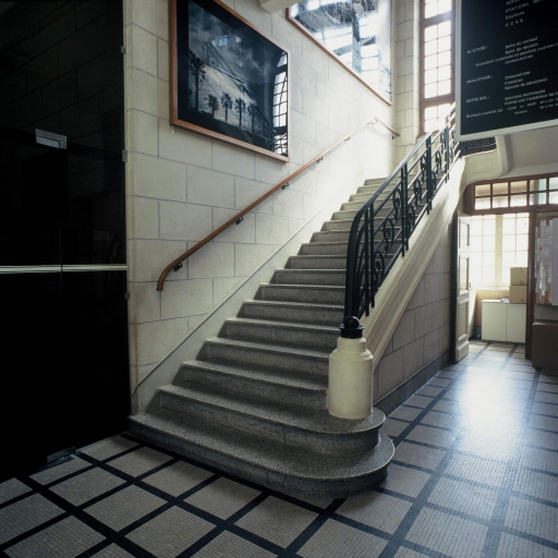 Escalier de distribution intérieur menant du hall à l'étage.Immatriculation
