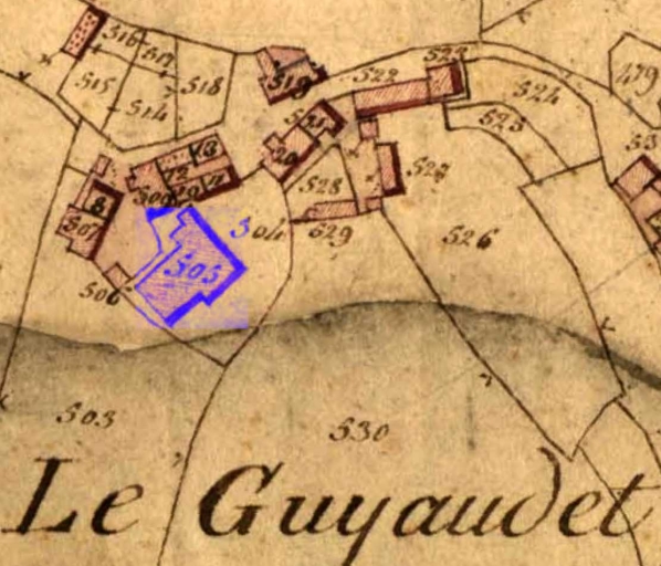 Extrait des plans cadastraux parcellaires de 1826 (AD 22). Plan au sol de la chapelle du Yaudet avant recontruction.Immatriculation