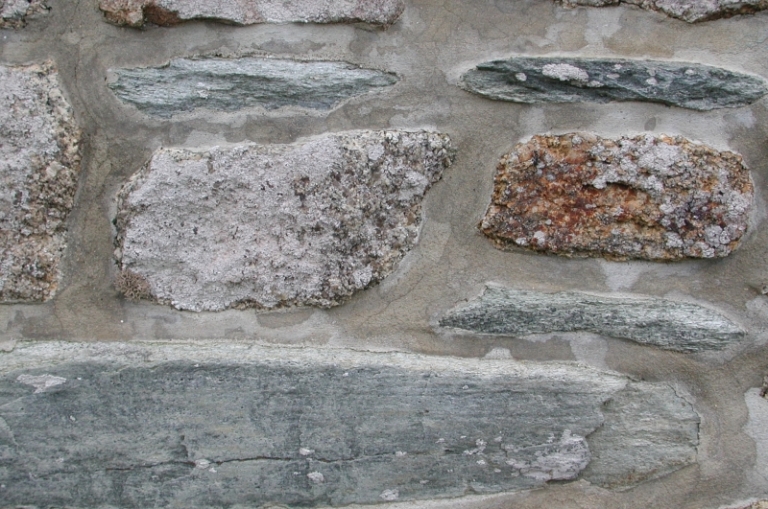 Détail d'assemblage des pierres de parement (granite et schiste)Immatriculation