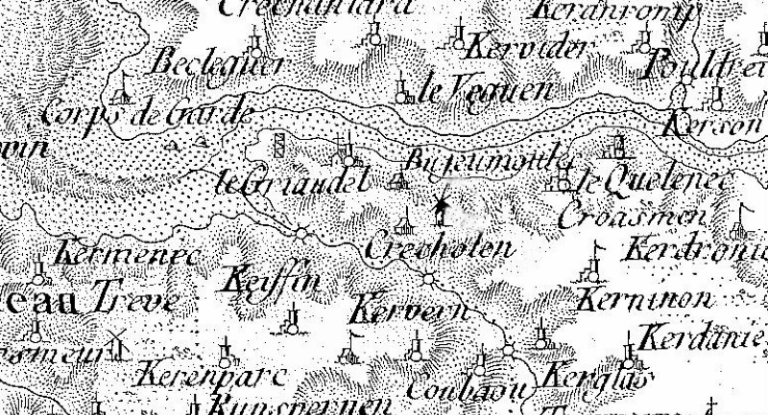 Extrait carte du 1er quart du 19ème siècle de Cassini avec les corps de garde et les moulinsImmatriculation