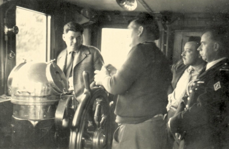Le pilote du Yaudet François Le Pierres à la barre d'un caboteurImmatriculation