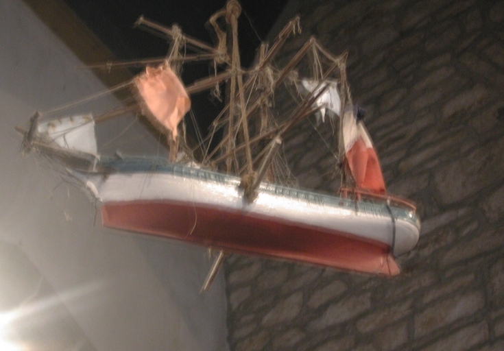 Vue générale d'une maquette ex-voto suspendue du type goéletteImmatriculation