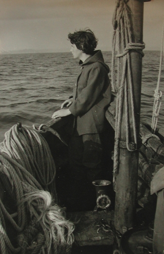 Bernadette Lojou sur la Jeanne d'Arc, avec le broyeur de boëtte à posteImmatriculation