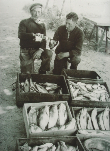 Lojou et Cojean devant leurs caisses de poissons : lieus, tacaudsImmatriculation