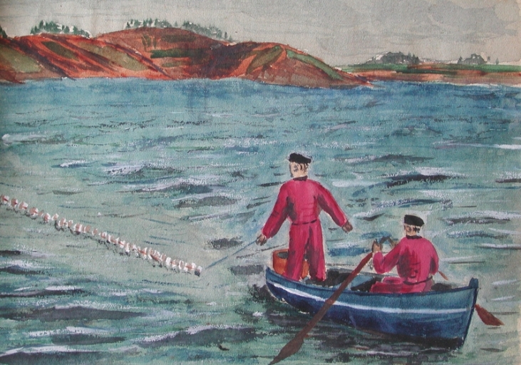 Le canot bout au vent pour maintenir le filet dans la lime et le matelot aux avirons (dessin de Yves Audern)Immatriculation