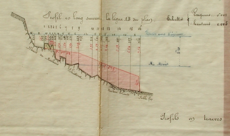 Construction de la cale inférieure, dite cale basse : profil en long selon la ligne AB, 1873 (AD 22)Immatriculation