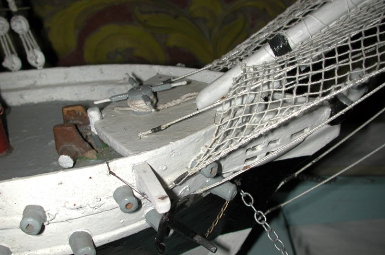 Vue de détail de la plage avant du trois-mâts ex-voto Zant-Quemeau : remarquer le guindeau à bras et le gréement du beaupréImmatriculation