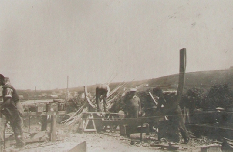 Le chantier naval Landouar : construction en plein air d'un grand flambart à cul de poule en 1935 : 1ère étape de la construction : assemblage quille, étrave, étambot et fausses piècesImmatriculation