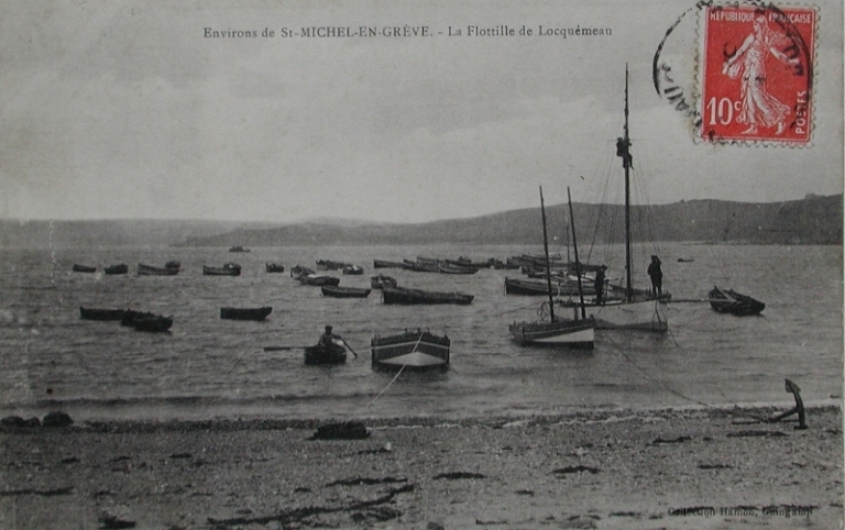 Les flambarts sont désarmés, sauf le grand canot à moustaches et le sloop avec mât de flèche appartenant à Yannick de Collet, directeur de la sardinerie vers 1930Immatriculation