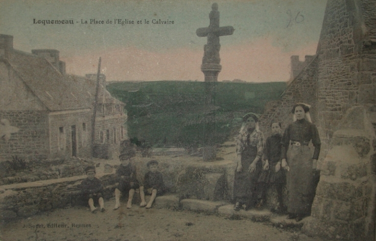 Jour de pardon le lundi de Pentecôte : costume traditionnel pour les filles, casquette de marin pour les garçons, pour la pose au pied du calvaireImmatriculation