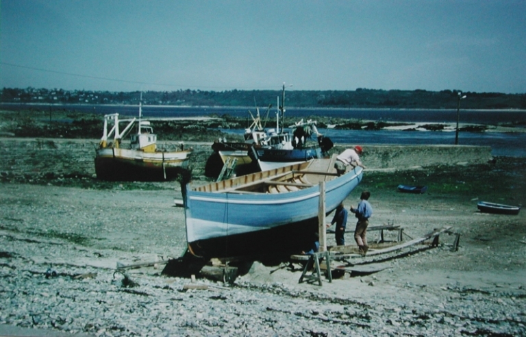 Coque du Barr Awel en peinture sur la grève avant la mise à l'eauImmatriculation