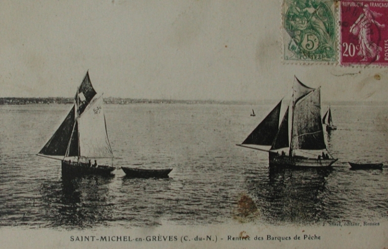 Barques de pêche, traînant leur doris, sur la côte de Saint-Michel-en-GrèveImmatriculation