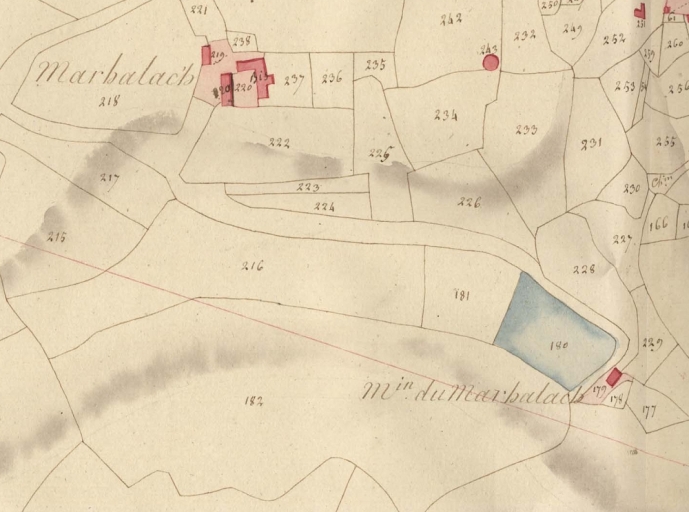 Extrait des plans cadastraux parcellaires de 1814 (AD 22). Vue générale du site manorial : manoir, colombier, moulin et étang du Marc'hallac'hImmatriculation