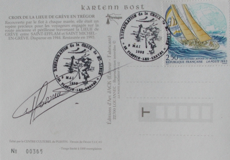 Flamme de la Poste éditée pour l'inauguration de la croix de la Lieue de Grève le 9 mai 1993 (dessin de Désiré Lucas)Immatriculation
