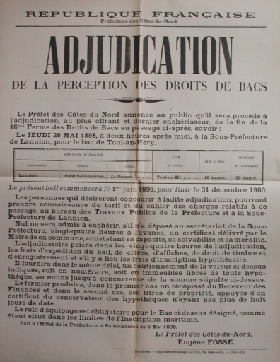 Adjudication du bac de Toul an Héry avec bail de fermage de 1898 à 1900 (AD 22)Immatriculation