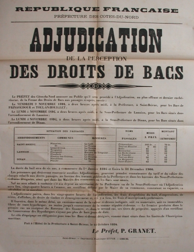Adjudication des droits de bacs de l'arrondissement de Lannion : Toul an Héry,1893-1894 (AD 22)Immatriculation