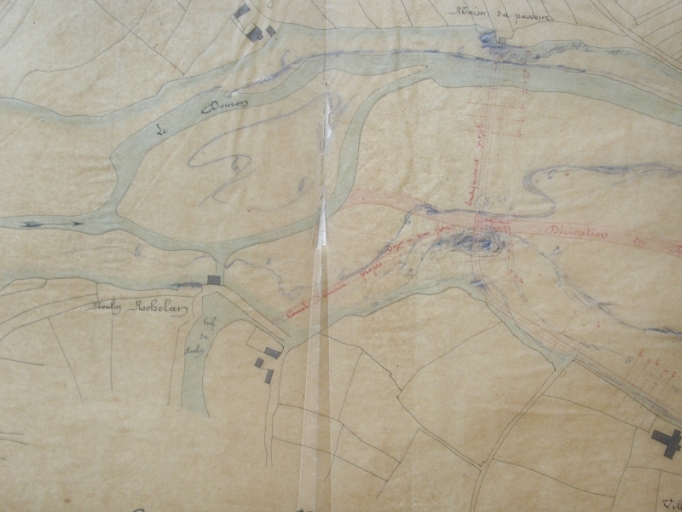 Plan des lieux en 1874 avec le projet d'endiguement et de canal de dérivation, refusé par l'administration (AD 22)Immatriculation