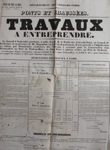 Soumission de travaux à exécuter pour un débarcadère et une jetée en pierres au port de Toul an Héry en 1845 (AD 22)Immatriculation