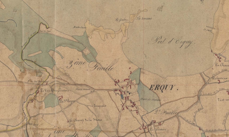 Erquy. Le bourg, le port et la plage de Caroual d'après extrait du tableau d'assemblage du cadastre de 1846 (AD 22)Immatriculation