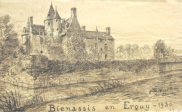 Château de Bienassis : vue générale depuis l'est en 1930 d'après croquis du vicomte Henri Frotier de La Messelière en 10 (AD 22)Immatriculation