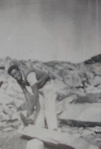 Augustin Rault père avec son marteau à pointe pour tailler, piquer la surface de la pierreImmatriculation