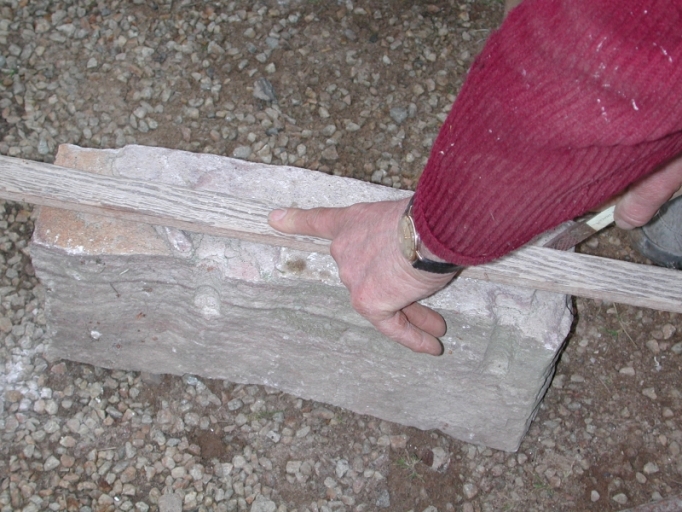Utilisation d'une régle pour mesurer la pierre, la marquer au crayon à tracer (traceur en bois rouge), avant de la taillerImmatriculation