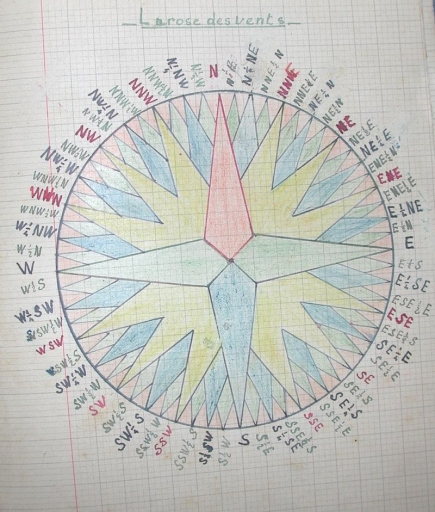 Vue de détail : dessin d'un compas de doris avec la division en 32 quarts (Raymond Pays)Immatriculation