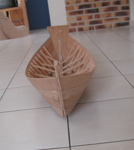 Vue de l'avant de la maquette d'un doris en construction (Edouard Lefèvre)Immatriculation