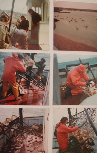 Drague à la coquille Saint-Jacques dans les années 1970 à bord du Nazado, gréé avec un portique (pêche arrière)Immatriculation