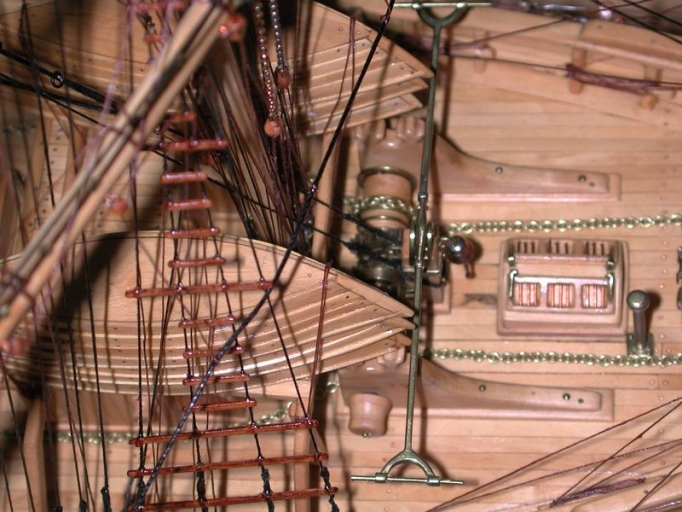 Vue du treuil devant le grand mât et des doris à l'avantImmatriculation