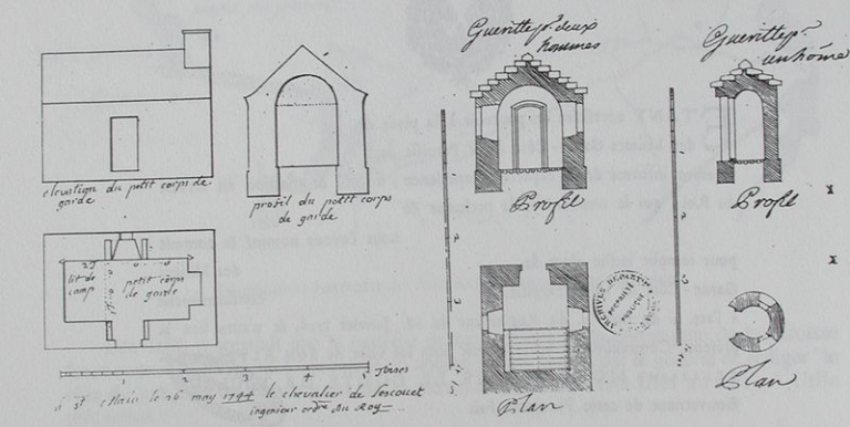 Plan-type d'un petit corps de garde et d'une guérite, modèle 1744, par le chevalier de Lescouët (AD 35, C 3670)Immatriculation