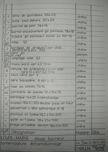Caractéristiques et dimension des sections du Louis-Marie en cm (Bernard Le Guen)Immatriculation